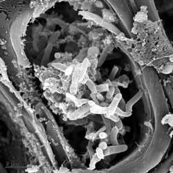 Image credit: Electron Microscopy Laboratory, U.C. BerkeleyPlum leaf scald (PLS) is a serious disease caused by Xylella fastidiosa subsp. multiplex, a pathogenic bacterium transmitted by insects with specialized xylem feeding (Hemiptera, Cicadellidae, Cicadellinae). In Brazil, the development of plum genotypes that apparently are not infected under field conditions has opened new prospects for disease control based on host plant resistance. As example, the 'SC13' and 'SC7' genotypes can not be infected under field conditions, although 'SC13' is infected by graft inoculation. So, we hypothesize that the performance of genotypes in the field may be related to the vector behavior. To clarify the possible relation of the genotype with the vector behavior we investigated the settling preference and xylem sap ingestion rates of the sharpshooter leafhoopers Bucephalogonia xanthophis Berg (1879) and Sibovia sagata Signoret (1854) (Hemiptera, Cicadellidae, Cicadellinae), as well as the probing behavior of B. xanthophis using the Electrical Penetration Graph (EPG) technique, on two Japanese plum genotypes ('SC7', 'SC13') contrasting with 'Laetitia' (susceptible to PLS). In the settling experiments, 'SC7' was less preferred by both vector species. 'SC13' did not affect settling, but reduced sap ingestion rates of S. sagata and also affected stylet activities of B. xanthophis, by increasing the duration of waveforms N (interruption of sustained ingestion during xylem phase), and the number of Xi and decreasing the duration of waveform Xi (active xylem sap ingestion). The results of settling and feeding behavior of the sharpshooters suggest that vector-plant interaction aspects are likely involved in the variation of disease intensity in the field.